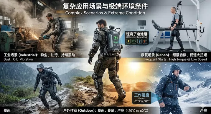 Further complicates the application scenarios and environmental conditions. Exoskeleton robots fit closely to the human body, requiring consideration of user comfort while coping with various complex environments: industrial scenarios may involve dust, oil, and continuous vibration; rehabilitation scenarios require frequent start-stop operations and low-speed, high-torque output; outdoor operations may encounter heavy rain, scorching sun, or extreme cold (operating temperature requirements range from -20℃ to 60℃). These highly dynamic operating conditions, long-term use, and close contact with the human body place extremely high demands on the battery's energy density, power characteristics, safety, and environmental adaptability.